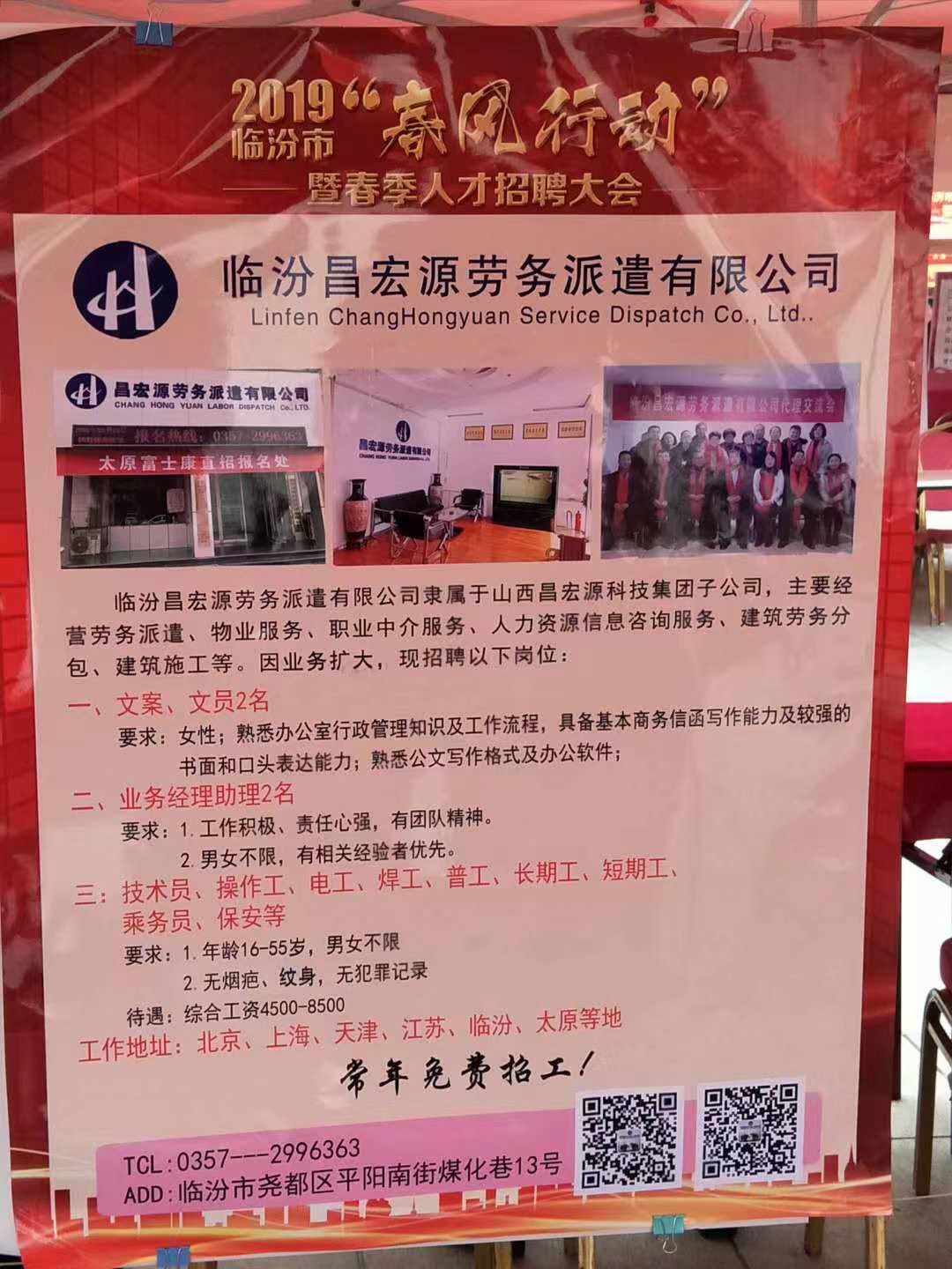 近日,昌宏源勞務派遣有限公司分別在臨汾市九州廣場和襄汾丁陶廣場舉辦了“2019年春季人才招聘會”,公司全體員工參與了本次招聘會。