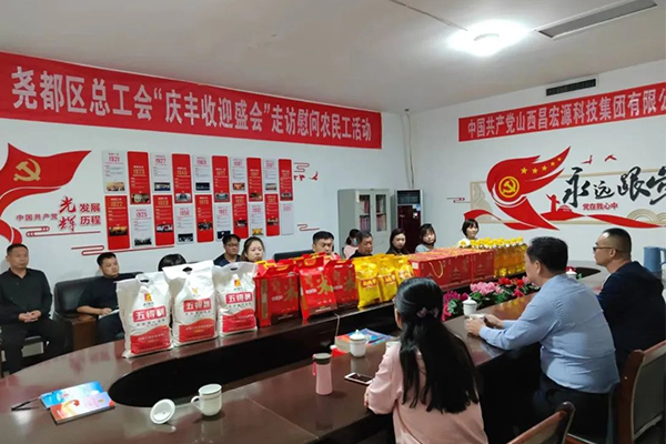 2022年是黨的二十大召開之年,是進入全 面建設(shè)社會主義現(xiàn)代化國 家、向第二個百年奮斗目標進軍新征程的重要一年,也是鄉(xiāng)村振興全 面展開的關(guān)鍵之年。為慶祝第五個“中國農(nóng)民豐收節(jié)”,9月28日下午,臨汾市堯都區(qū)總工會開展以“慶豐收 迎盛會”為主題的慰問農(nóng)民工活動,區(qū)總工會主席秦奇杰等一行人來到我們山西昌宏源人力資源股份有限公司對13名農(nóng)民工進行走訪慰問,為我們送來米、面、油、小米、五谷雜糧等慰問品。