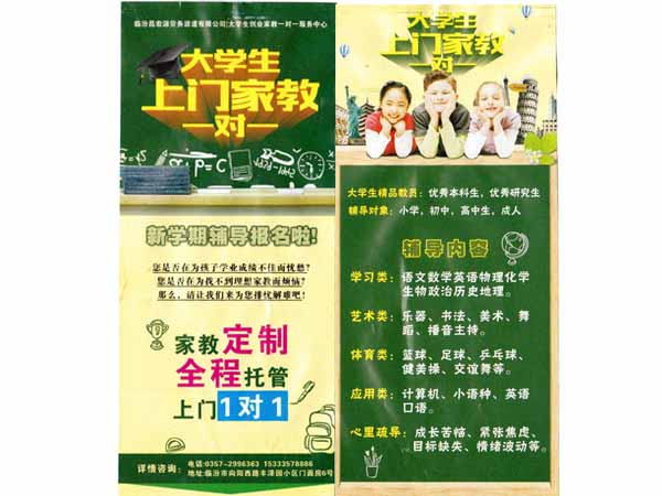 本公司常年進行”一對一“小、中、高文化課和特長等的輔導。我們公司薈萃了優(yōu)質教師及各個名校大學生,幫助各年級學生在短時間內掌握正確的學習方法,大幅度提高學習成績,并養(yǎng)成良好的學習習慣。